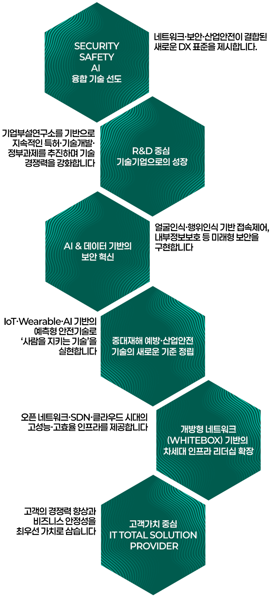 정보보안(Security), 산업안전(Safety), 네트워크 인프라, AI 기술을 융합한 통합 ICT 기업입니다