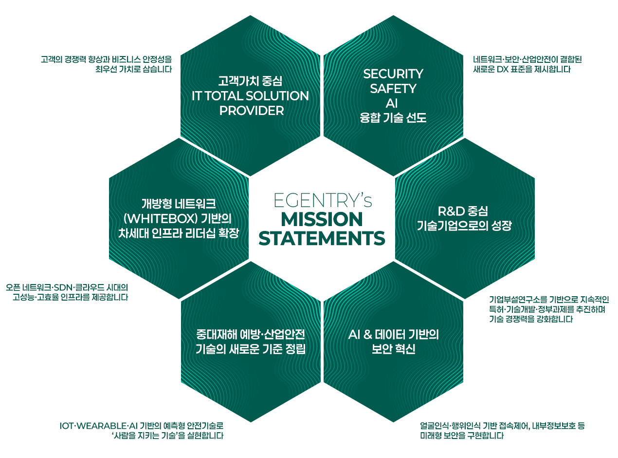 EGENTRY는 단순한 장비 공급사업을 넘어, 장비 유지보수, 컨설팅을 통해 Network·Security·Safety·AI가 하나로 융합되는 미래의 DX 환경을 구축하는 기술 리더로 자리매김하고 있습니다.